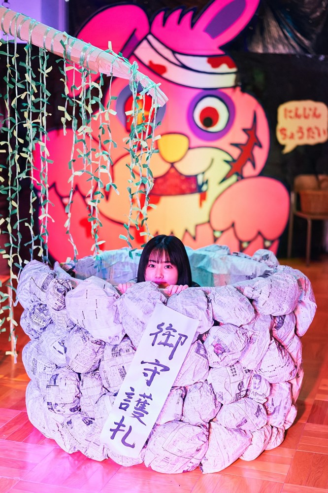 映像では、原さんが劇中で制作した「みこ柳」(原命名)のオブジェや、ウサギの看板の仕掛けも紹介。久渡氏は「ハナ(久間田琳加)をギャーギャー言わせたい」と意気込みを語り、その願いは叶った。なえなのがプロモーションで「本気でウサギの仕掛けにハナがビビり散らかしていた」と暴露し、「私も現場でハナの反応見て笑っちゃいました。めっちゃ叫んでて、リアルで面白かったです」と付け加えた。久間田さんは「ウサギの看板、ほんとに怖かったんです! 飛び出してくるタイミングが絶妙で、心臓バクバクでした」と振り返り、撮影の臨場感を伝えた。