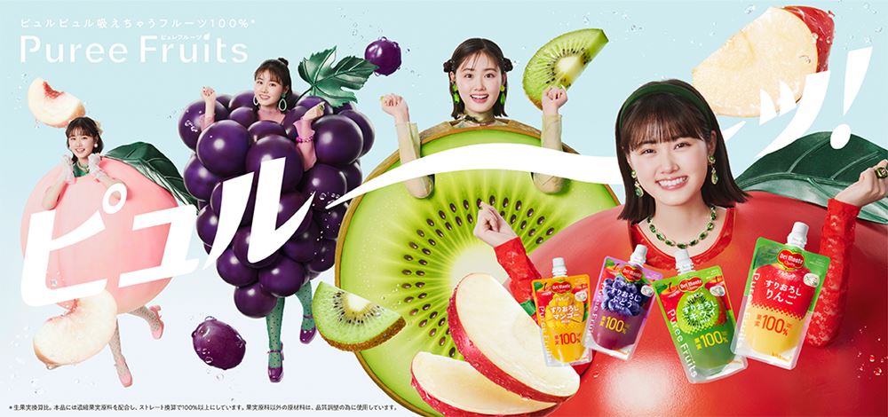 「デルモンテ ピュレフルーツ」は、果実100%(生果実換算比)のすりおろしフルーツで、いつでも手軽に果実摂取ができる点が魅力だ。今回の新CMでは、原菜乃華さんが“くだものそのもの”に変身し、製品の弾けるようなフレッシュさを可愛く表現している。CMソングは、製品を食べる様子をイメージした擬音語「ピュルピュル」を歌詞にした『ピュルピュルのうた』と、通常の歌詞による『ピュレフルーツのうた』の2種類があり、視覚・聴覚ともに楽しく、思わず歌いたくなるような内容に仕上がった。