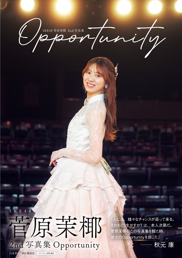 アイドルグループ・SKE48の菅原茉椰さんが、8月6日に刊行する2nd写真集『Opportunity』(白夜書房)について、総合プロデューサーの秋元康さんによる帯コメントと、3種類の裏表紙が公開された。