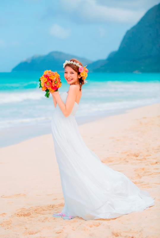 ハワイの挙式でも着用した、桂由美氏プロデュースの純白のオーダーメイドドレス。