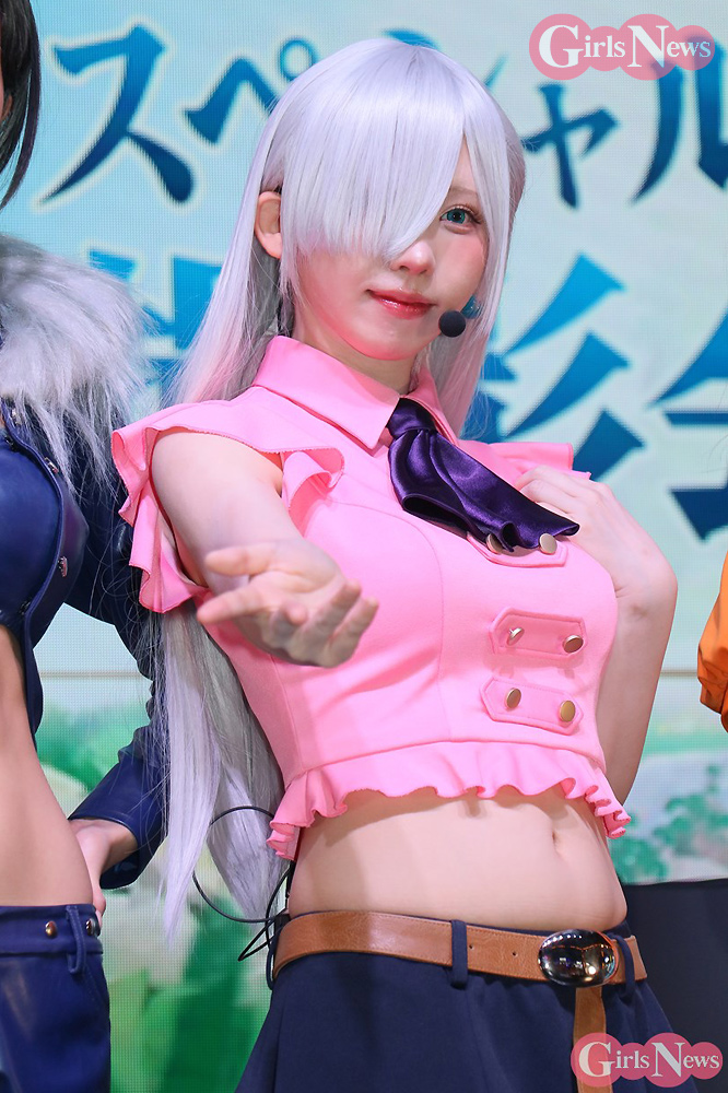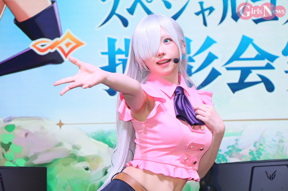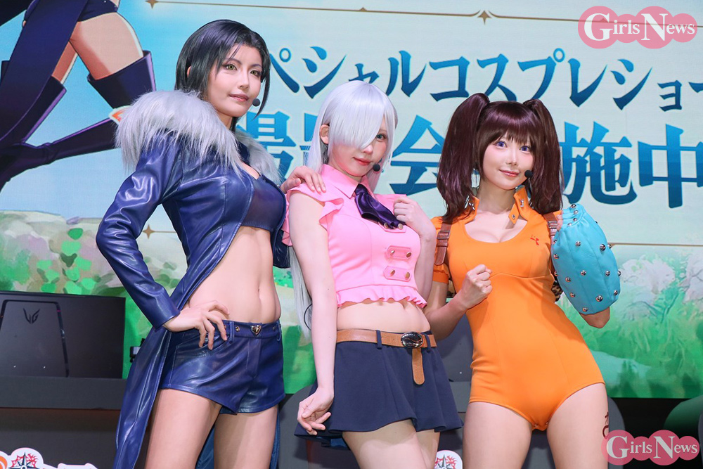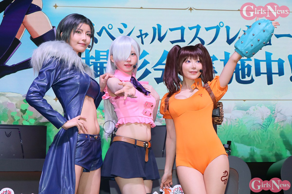 えなこは、エリザベスのコスプレで出演。「エリザベスのスタイルに近づけるようにトップスの丈にこだわりました」とコスチュームのポイントを明かした。篠崎こころはディアンヌの衣装について「お尻のラインがよく見えるようにミリ単位でこだわりました」と解説。南あみはマーリンの衣装を「原作はもっとセクシーですが、ちょっとアレンジされてます。襟のファーが気に入ってます」とコメントした。