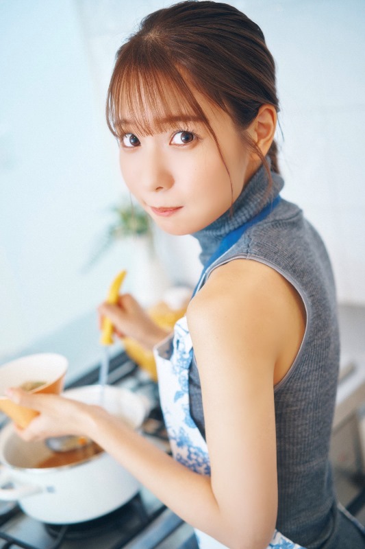 「小さい頃から楽器が好きで習っていたり、ドラムも初めて触ったのが小学5年生の頃で…そこから少しやり始めたんですけど、大好きな音楽と一緒に水着の撮影ができたことがすごく嬉しかったです! あとは…やっぱり奥さんと言えばエプロン! タイトなニットワンピと青いエプロンのコーデがめちゃくちゃ可愛くて、こんな服着て奥さんしたいなと思いました! 撮影ではりんごの皮を久しぶりに剥いたよ~! 久しぶりにしては上手く剥けたと思います…!」と撮影を振り返った。