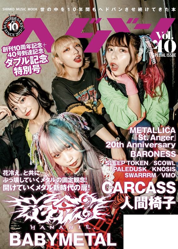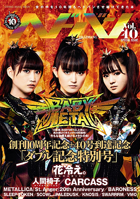 創刊10周年記念+Vol.40到達記念=「ダブル記念特別号」の同誌。新生BABYMETALのほか、裏表紙&大特集は、海外で人気沸騰のガールズ・メタルコアの花冷え。、 そして、9月に新作を発売する人間椅子も大特集。「ヘドバン」を象徴する3組のアーティストを増ページで届ける。