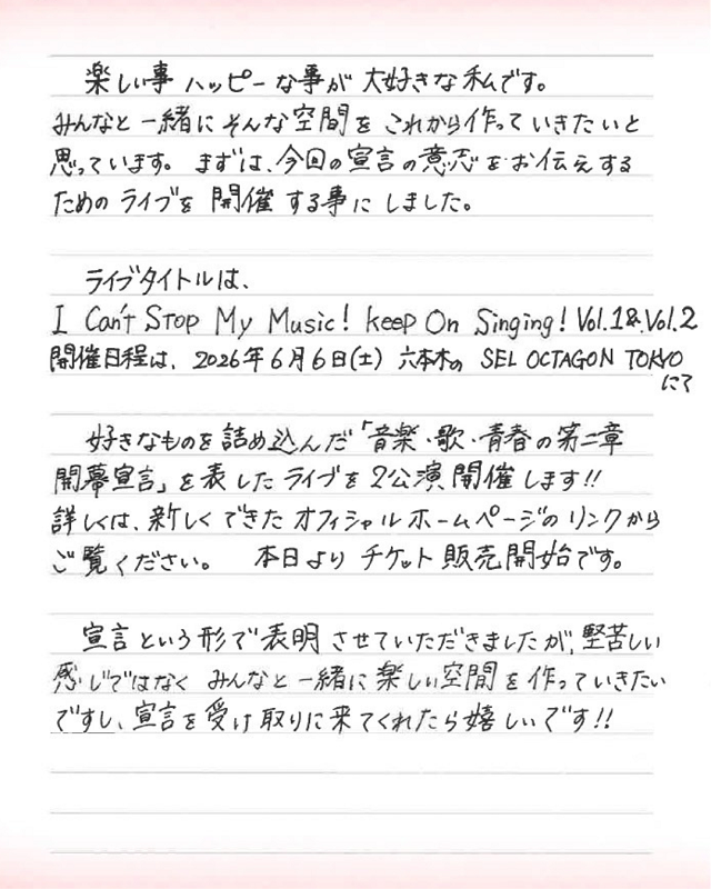 先月31日に解散したガールズグループ「東京女子流」の元メンバー・新井ひとみが、自身の誕生日である4月10日、「音楽・歌・青春 第二章開幕宣言」と題し、音楽活動の継続をInstagramでのライブ配信と、SNSに公開した直筆の手紙で発表した。