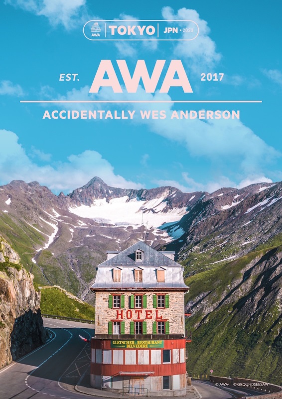 2022年、韓国・ソウルで25万人を動員した AWA 展が、「ウェス・アンダー ソンすぎる風景展」として日本に初上陸。AWA とは、《Accidentally Wes Anderson》の略称で、世界の実在する 風景から、ウェス・アンダーソン監督の映画に出てきそうな場所を撮影し投稿する人気 Instagram コミュニティ。