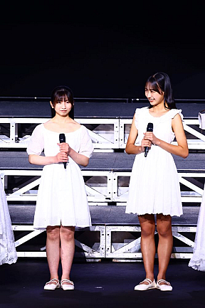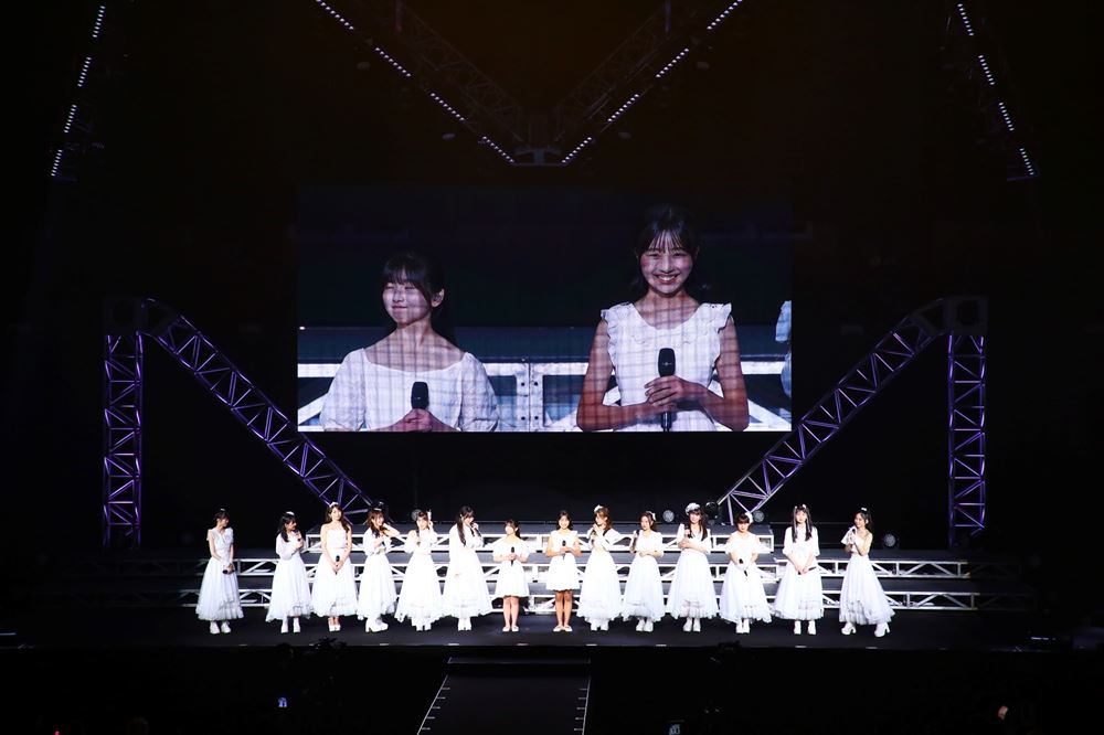 続いてメンバーカラーとコールの愛称が発表された。挨拶で「最近覚えた難しい言葉は、乗り越し精算です」とツカミもバッチリだった井上さんは“ミントグリーン”で、“はるさん”。「得意技は高速ラジオ体操」と自己紹介した弓桁さんは“ピュアレッド”で“げったー”に決まった。客席は即座にペンライトの色を変えて、二人を暖かく迎えた。新メンバー加入は約1年ぶりで14人体制となる。