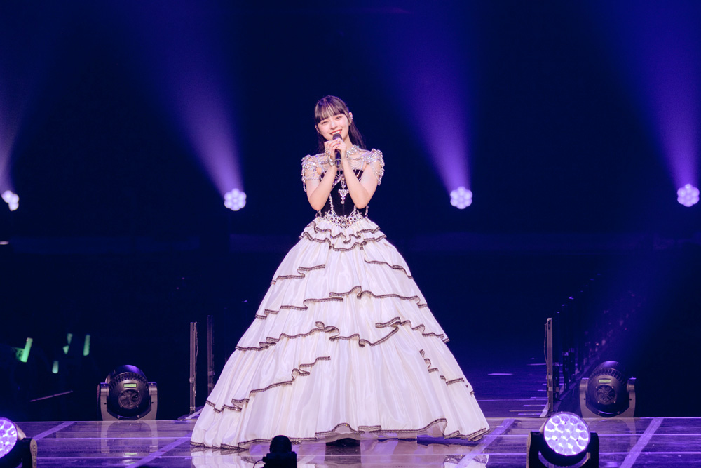 会場が上國料のメンバーカラー・アクアブルーのペンライトに染まる中、ドレスをまとった上國料がステージに登場。公演のタイトルにちなんだキラキラと輝く白いドレスで、胸元や肩にはアンジュルムへの愛がこもったハートのビジューがあしらわれている。卒業への思いをつづった手紙では、9年半の活動を振り返って「大好きと心から言えないような苦しい