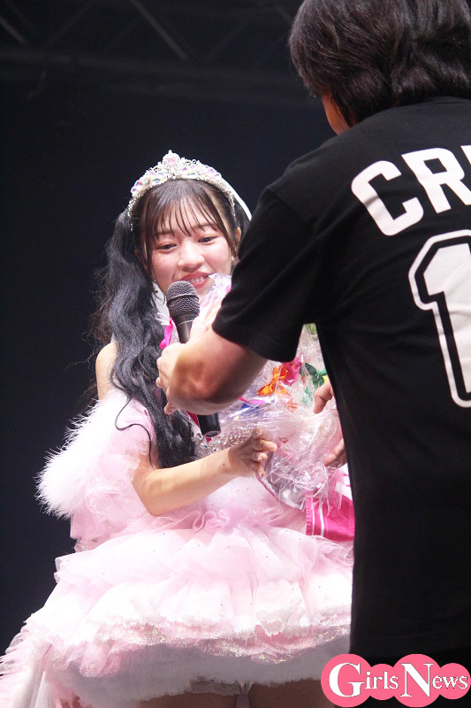 ここで、LinQマネージャーの三浦氏が花束を抱えてステージに登場。ファンに向かって挨拶する三浦氏の声も涙まじりだ。「今日はファンのみなさまを代表して、そして自分から、14年間LinQを支え続けてくれた悠未への感謝の思いとしてこの花束を届けたいと思います」と語り、現在のLinQメンバーを表す内容の花束を手渡すと、場内は温かなムードにつつまれた。