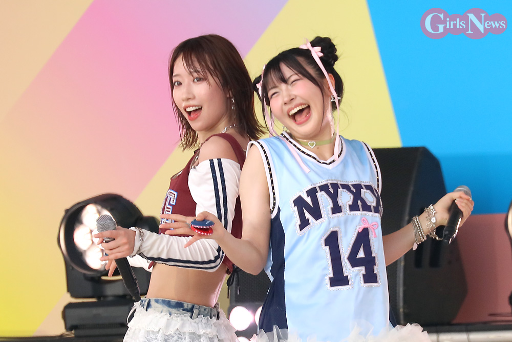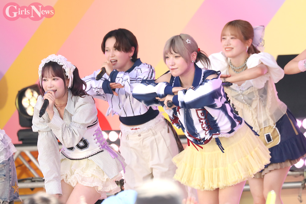 最初のMCでは、高瀬くるみが「一番熱い時間に、この野外ステージに集まってくれたみなさん、こんにちはー!」と挨拶。炎天下の観客を気遣い、平井美葉も「ちゃんと水分補給してください、ここでね」と呼びかけた。