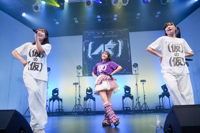 広いステージに3人というミニマム編成で戦いを挑むアプガ(仮)の(仮)は、気持ちと勢いで観客とともに会場の熱量を上昇させる。彼女たちは「キラキラミライ」をパワー全開で歌唱し、「アルストロメリア」ではエモーショナルな思いを歌とダンスでファンを魅了した。