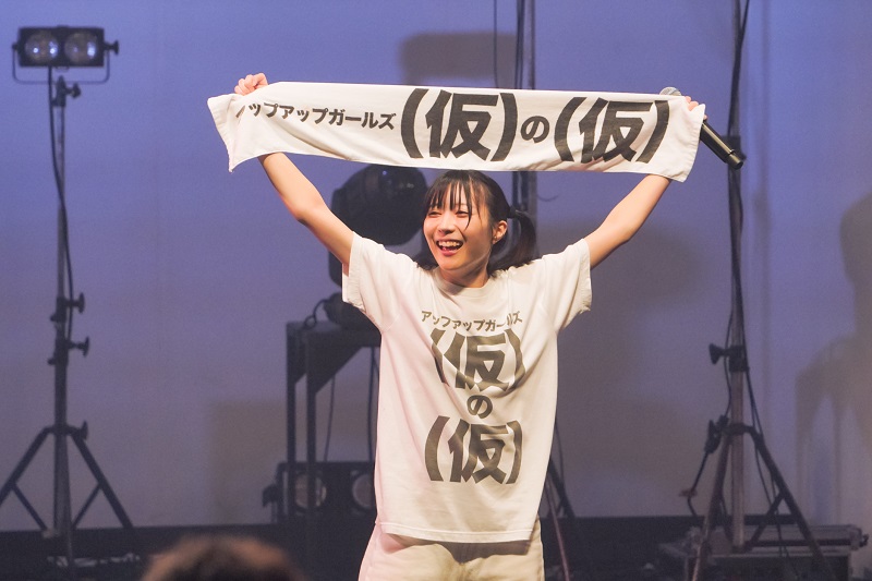 最後のMCタイムで、サプライズで届けられた山田社長の手紙を青柳が代読する。青柳、MINA、MARINに向けて「100枚ずつ用意したアプガ(仮)の(仮)Tシャツとタオルが完売しました。ファンのみなさんが掲げてくれた(仮)の(仮)タオルとTシャツで埋め尽くされた光景は、3人の全力のパフォーマンスがアプガファミリーの心を動かした何よりの証です。君たち3人は立派なアップアップガールズ(仮)です」「今着ているアプガ(仮)の(仮)Tシャツから、今渡した(仮)Tシャツを着てください!」との言葉から、3人は晴れてアプガ(仮)Tシャツを着用する。