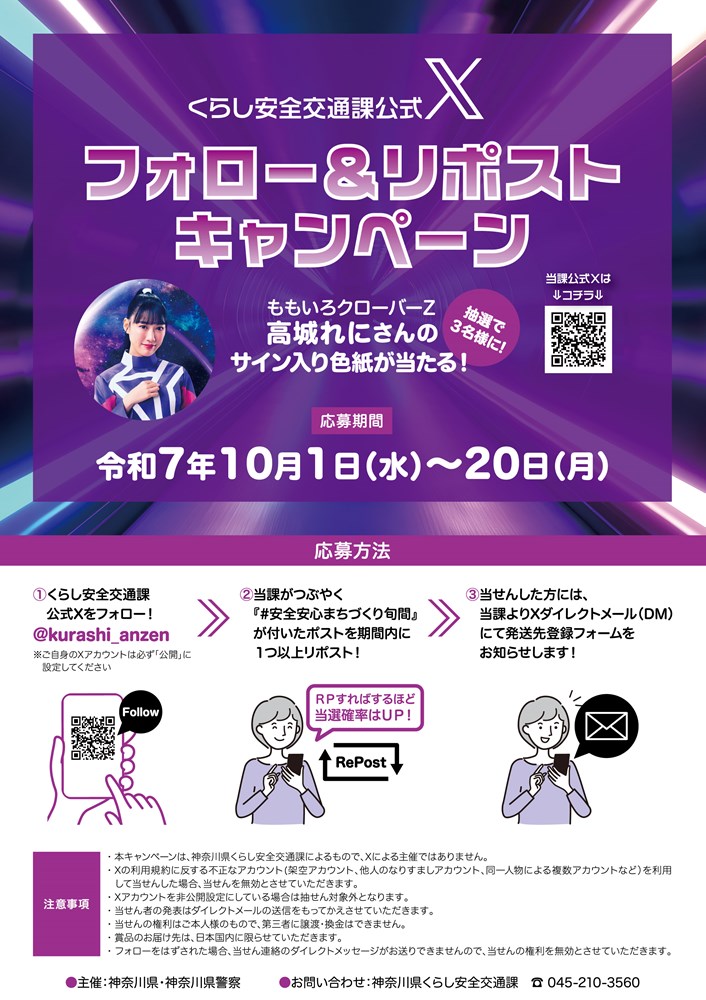 なお、くらし安全交通課公式Xでは、10月20日までの期間限定で「フォロー&リポストキャンペーン」を実施している。公式アカウント(@kurashi_anzen)をフォローし、「#安全安心まちづくり旬間」が付いた指定の投稿をリポストした人の中から抽選で3名に高城れにさんのサイン入り色紙がプレゼントされる。