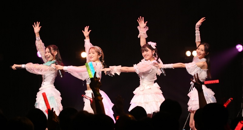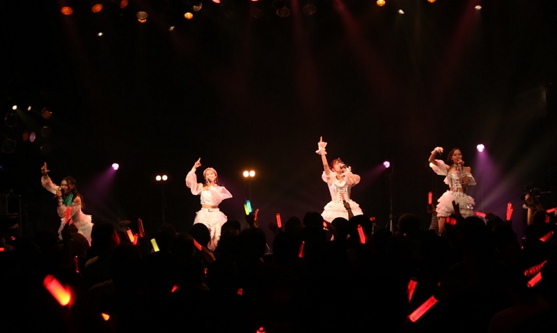 照明とサウンドが一変し、一気にクールでエモーショナルな空間へと切り替わる。白の衣装を纏った4人が登場すると、フロアは赤のペンライトに染まり、『Reborn』、『ミルフィーユ』と勢いを感じるナンバーを立て続けに披露、観客を魅了する。そこから一転大人の恋心を表現した『Viva La 恋心』を披露。グルーヴ感はそのままに、『きっと 忘れない、、、』から、観客からの「フライデーナイト!」の掛け声と共にキュートな振り付けが印象的な『フライデーナイト』へ。ミラーボールがディスコのような雰囲気を演出する中、心地よい高音と、軽快なステップや手を振る仕草で観客を魅了した。