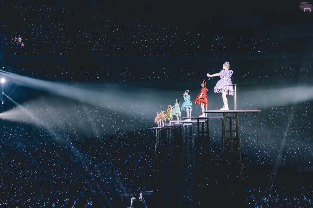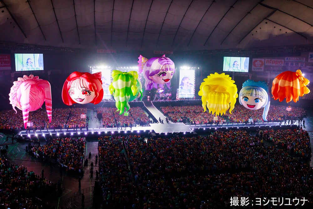 ライブは、宙を舞う巨大な顔型の気球に乗った7人の登場でスタート。通信で連動するサイリウムなど、会場全体を使った光の演出や、宇宙船を模したゴンドラカーなど、大掛かりの演出の連続で観客の度肝を抜いた。