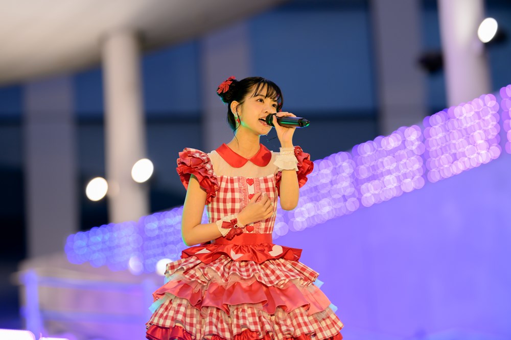 日が沈んだ屋外のイベントスペースに、赤いチェック柄の衣装で登場した大西さんに、観客からは「あぐぽん!」という呼びかけと大きな拍手が起こる。「ありがとうございます。こんなにたくさん集まっていただけるなんて…」と冷静に驚いてみせると「今日は5thシングル『夢で逢えなくても/指先ハート』の発売日です。ここは思い出の地でもあって……。わたし的には『ラブライブ!虹ヶ咲学園スクールアイドル同好会』でも、ここが初めてのステージだったし、スクスタの『KAGAYAKI Don’t forget!』でメンバーがライブをしていた会場もこの場所、優木せつ菜ちゃんのライブを見て、歩夢ちゃんがスクールアイドルを始めるきっかけになったのもここなので、そんなたくさん思い出のある場所で歌う事ができて嬉しいです。楽しい思い出が作れるように頑張っていきたいと思います!」と言うと、大きな拍手が起こった。