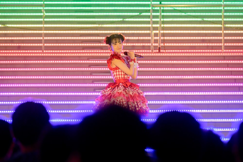 ミニライブの最初に披露したのは、大西亜玖璃渾身のロックナンバー『夢で逢えなくても』。爽やかであり切なくもある、いろいろな感情を乗せたボーカル。サビでは魂のこもった歌声で盛り上げると、長い間奏のギターソロでは、何度も拳を振り上げていく。それに合わせて観客も拳を振り上げながら「オイ!オイ!」と声を上げていたが、途中で勢いが少し緩んできたのを感じると、「諦めないっ!」と力強く煽っていくあぐぽん。そこからはみんなも全力で声を出し、ロック魂を見せつけていた。曲の終盤も力強い歌声を広場中に響かせ、この曲の最後にある情熱的なセリフをぶつけると、最後に「ロックンローーール」と叫び、右手を高らかに掲げる。彼女の新たな魅力を見せたパフォーマンスでもあった。
