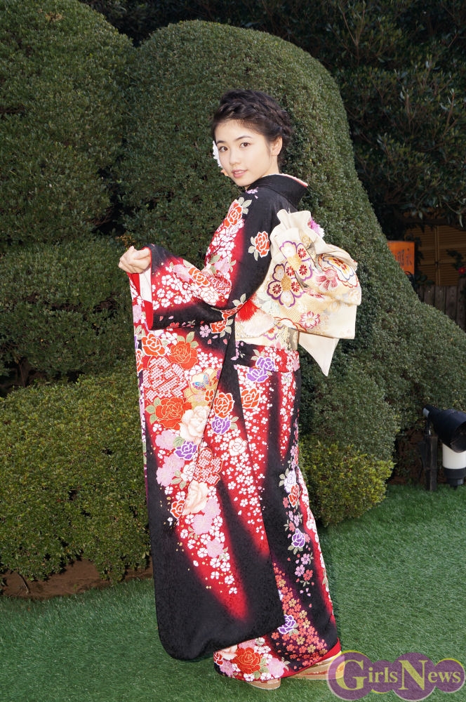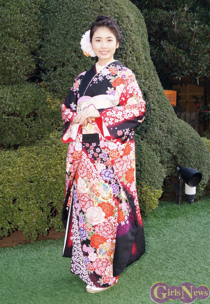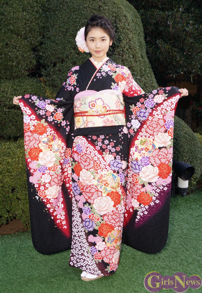 晴れ着のポイントについて「黒とか紫とか格好良いのが好きで、しかも黒字に赤のお花なので、すごく赤が映えてゴージャズなお着物なので嬉しいです。」とコメント。