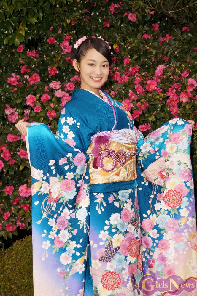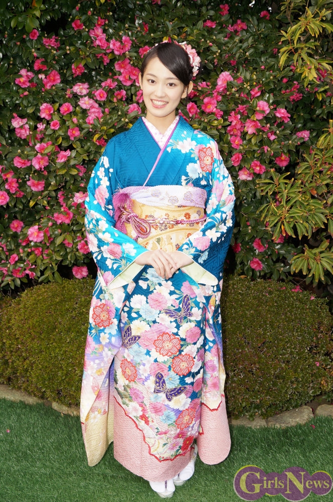 晴れ着姿について「髪飾りがピンクで、お着物の一番下がピンクっぽい色になっていて、その間を挟むように青色のグラデーションになっているところがお気に入りです。」とニッコリ。