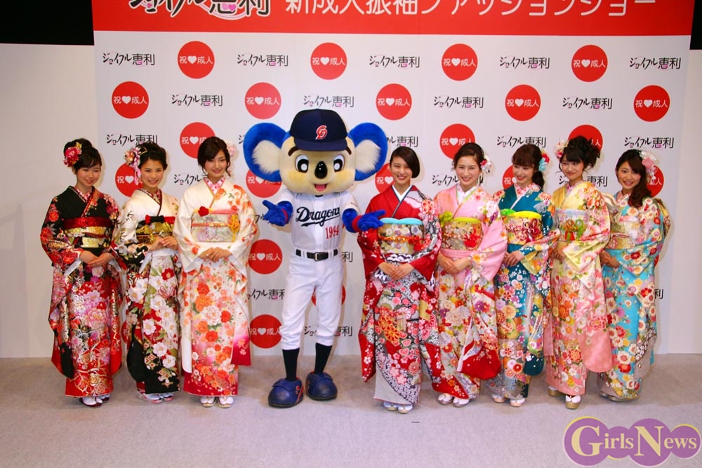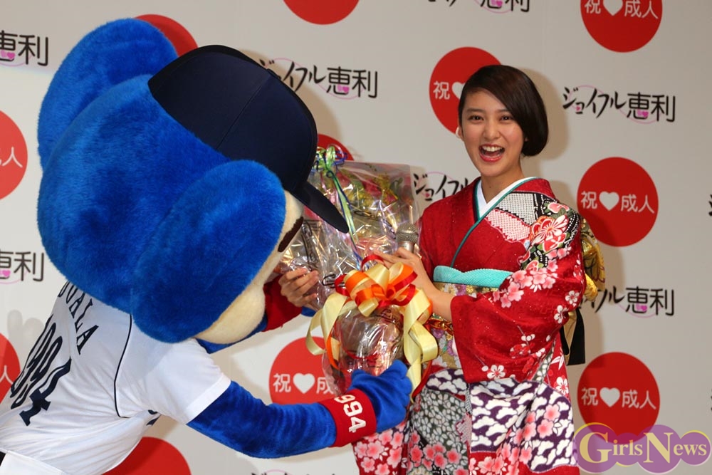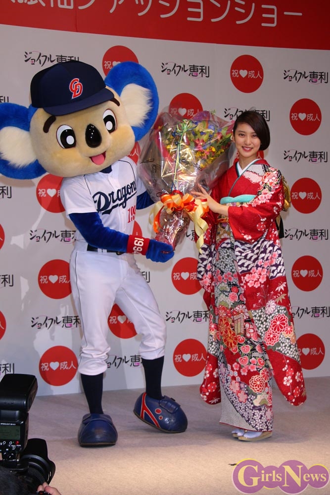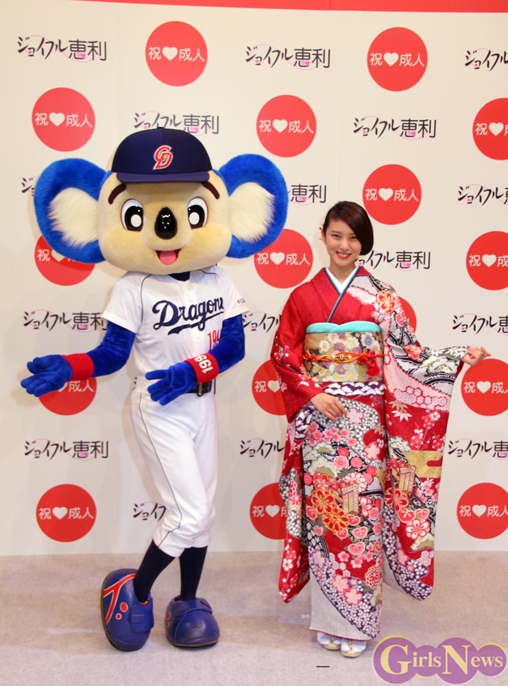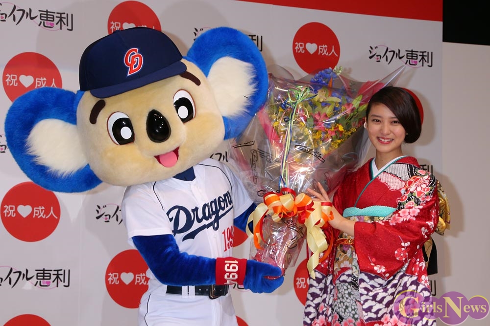 そして、武井咲さんの成人を祝って中日ドラゴンズのマスコット・ドアラさんがお祝いに登場すると、さらに顔をほころばせて喜んだ。