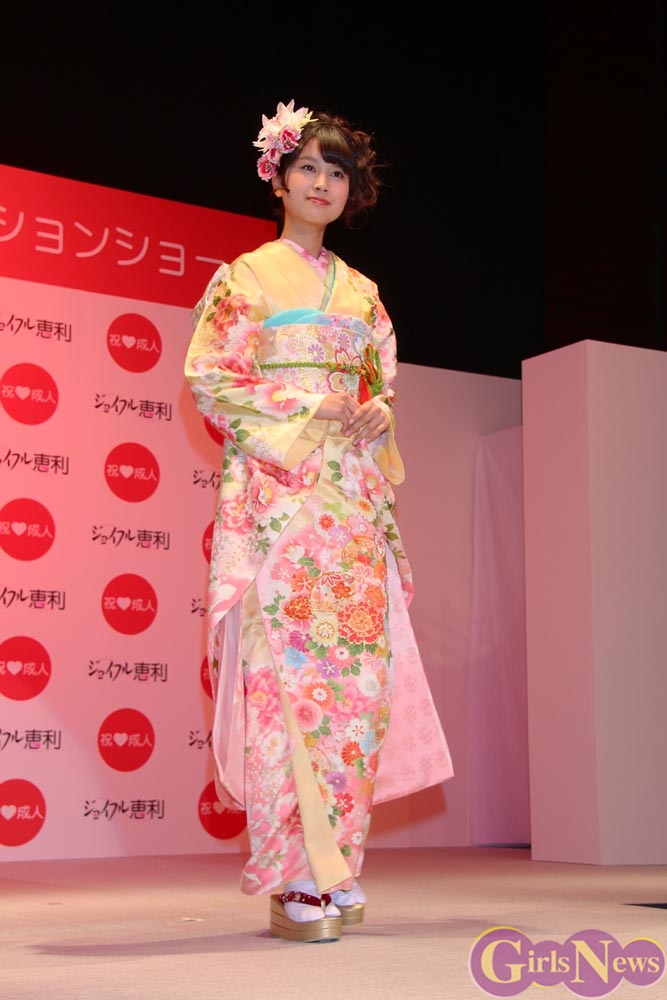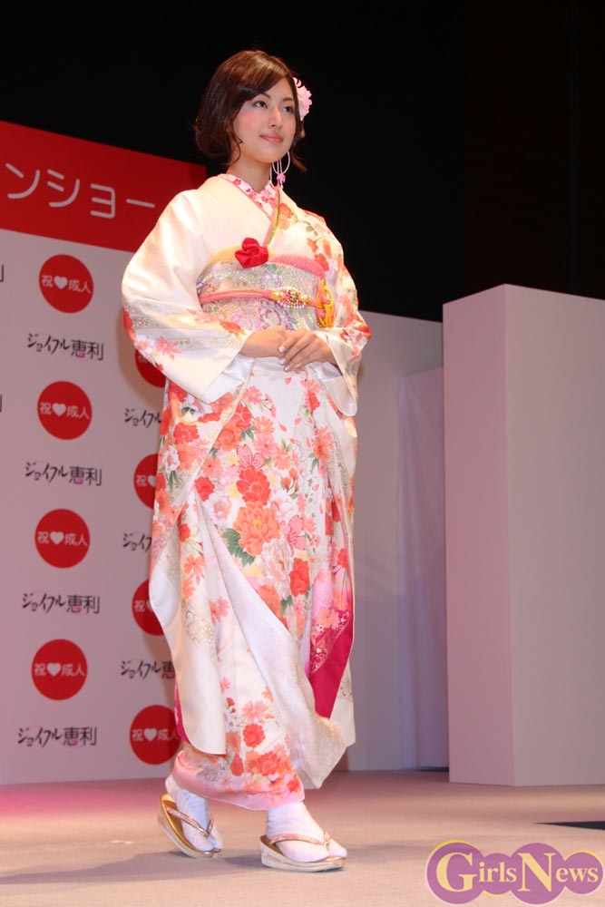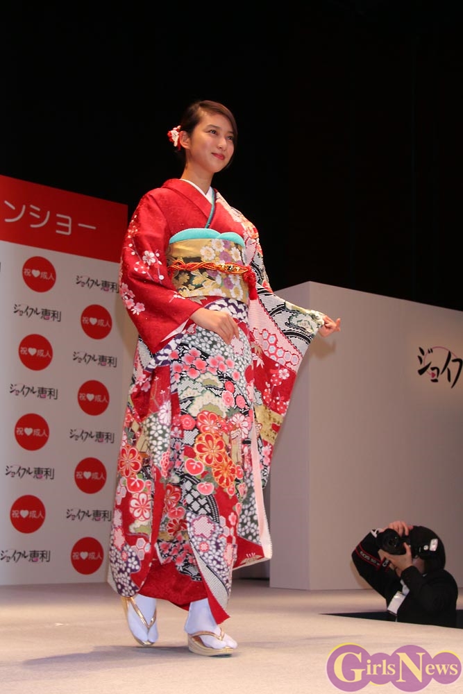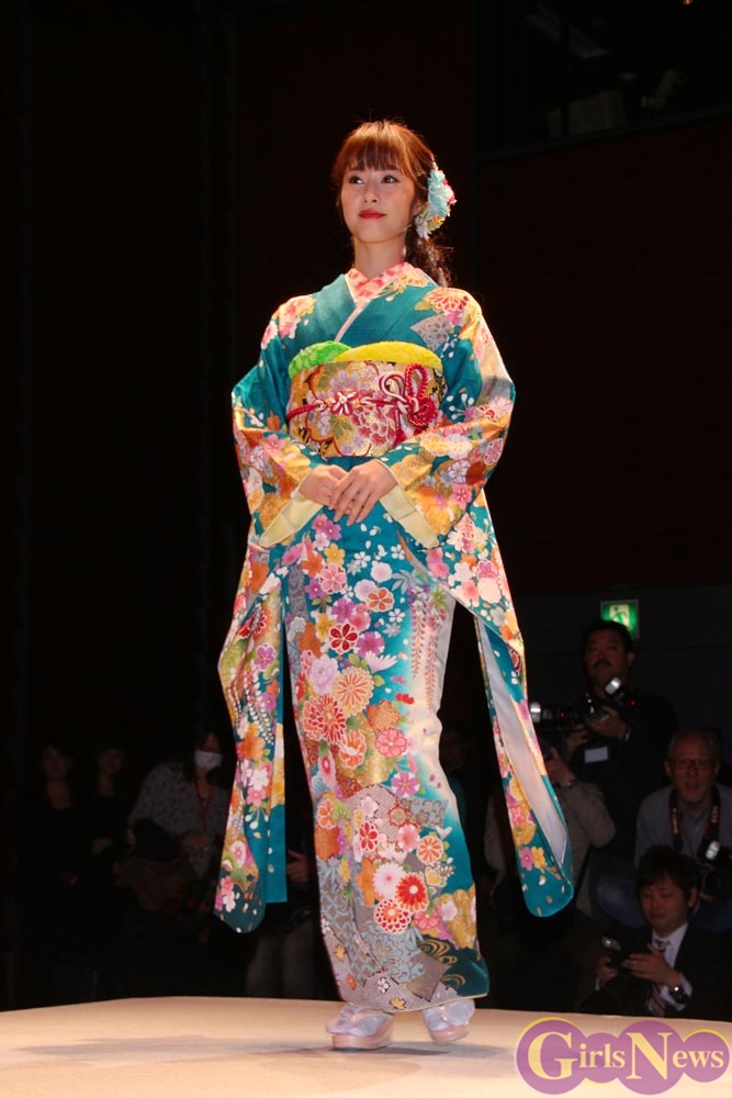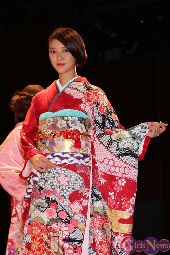 1月9日、女優の武井咲さんがイメージキャラクターを務める振り袖専門店『ジョイフル恵利』の新成人振り袖ファッションショーが東京・銀座の時事通信ホールで行われ、振袖姿を披露した。