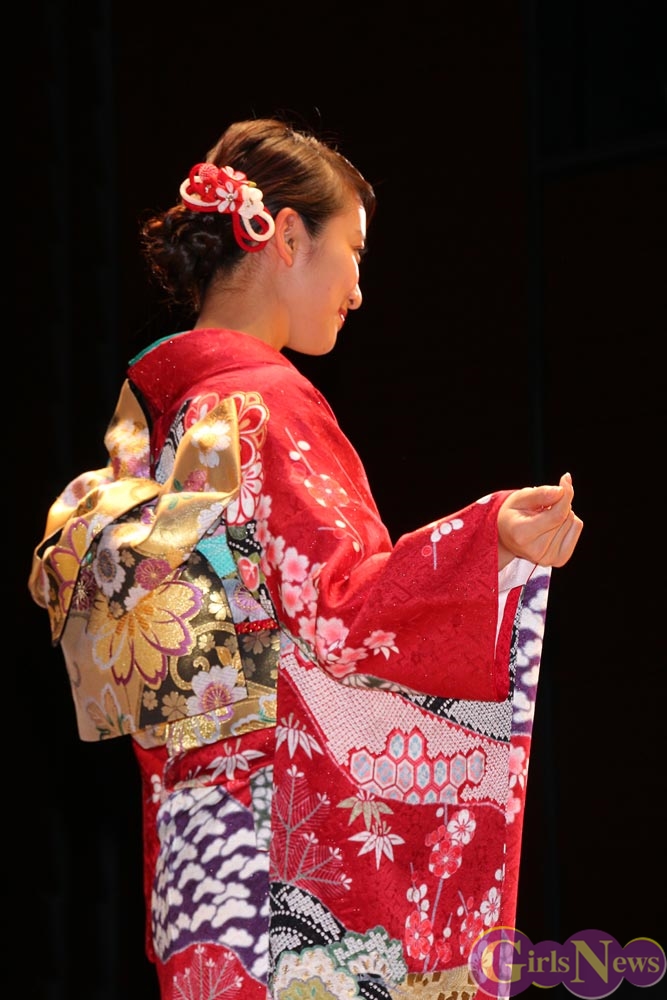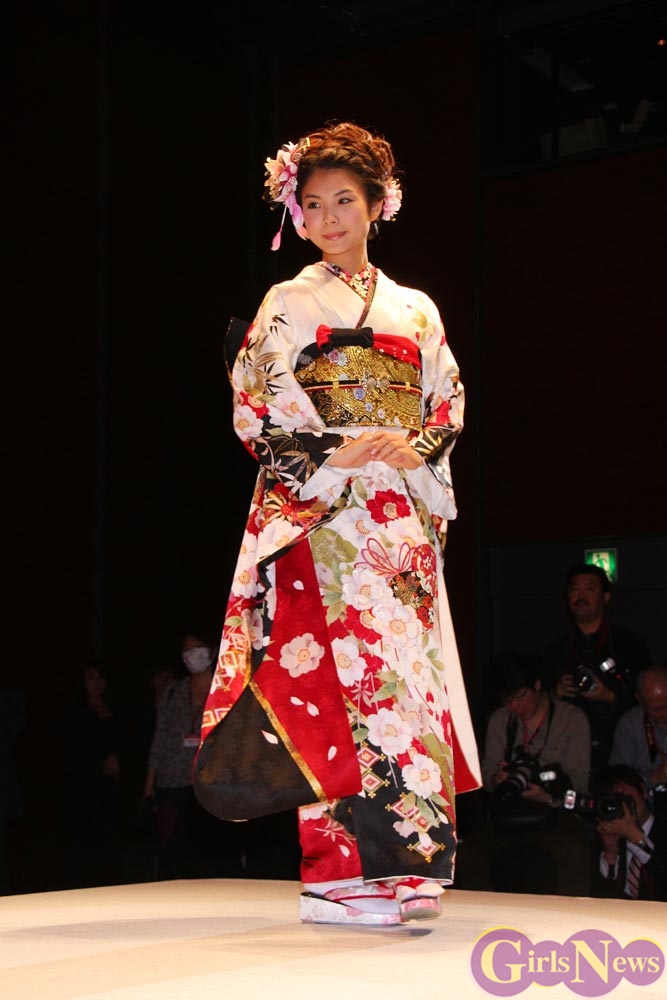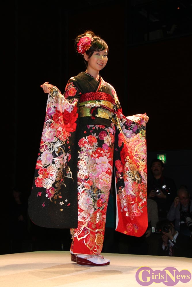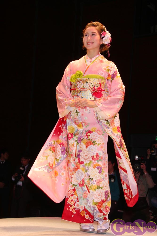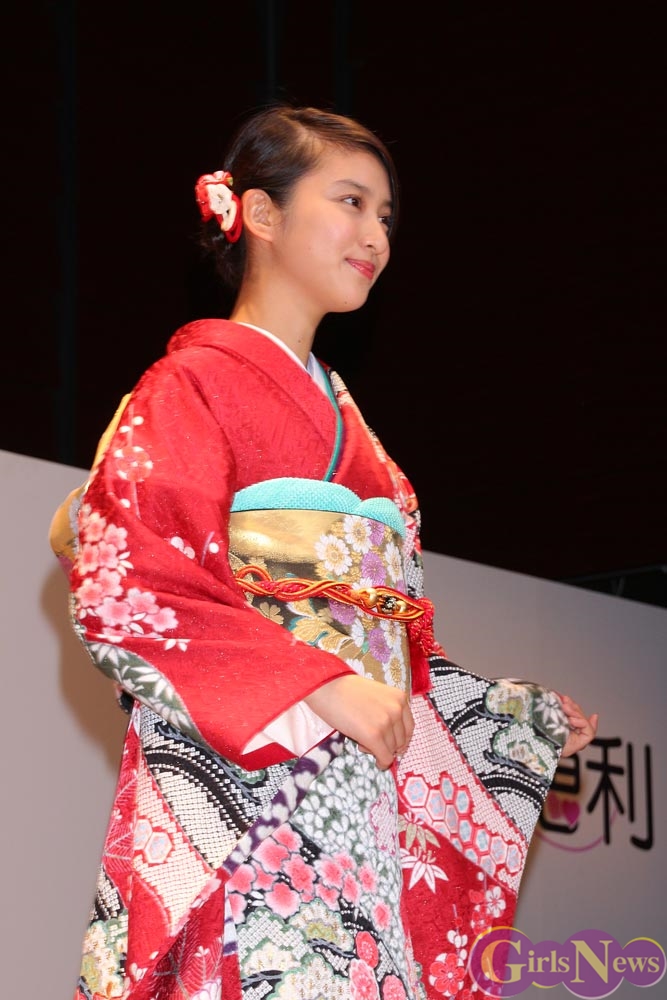 1月9日、女優の武井咲さんがイメージキャラクターを務める振り袖専門店『ジョイフル恵利』の新成人振り袖ファッションショーが東京・銀座の時事通信ホールで行われ、振袖姿を披露した。