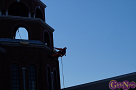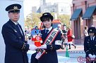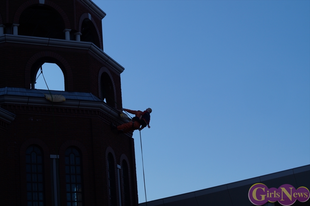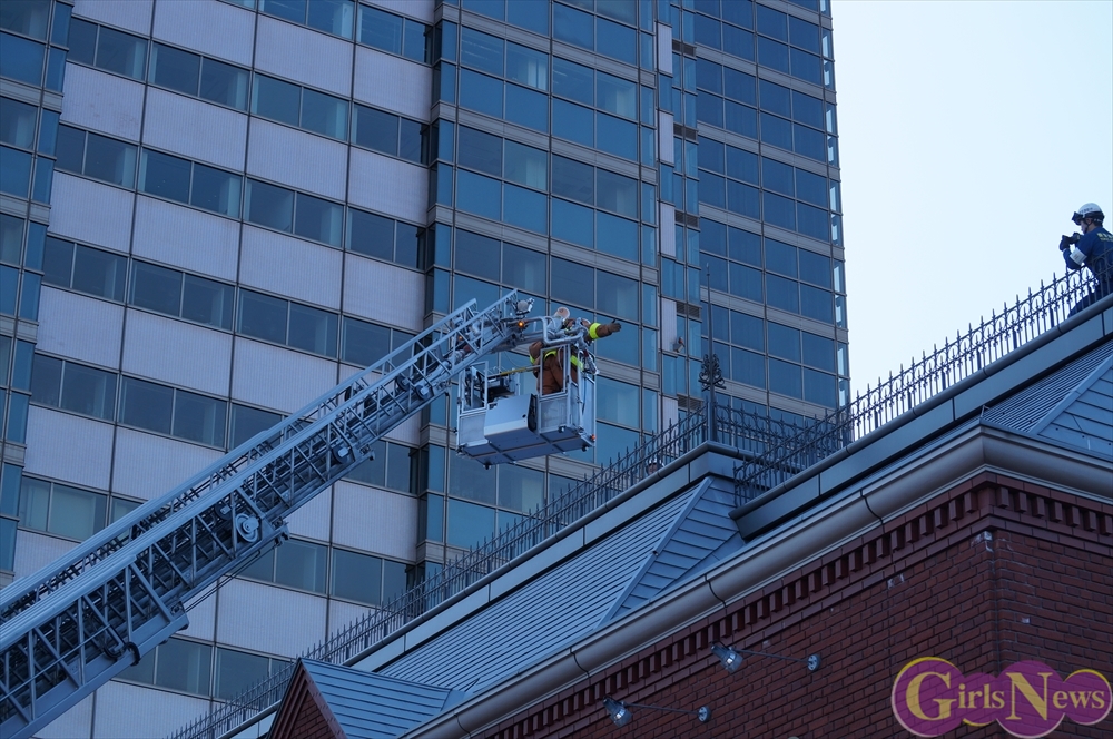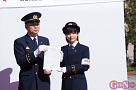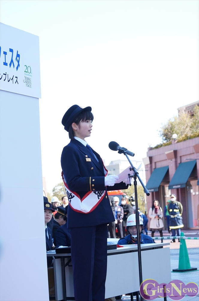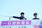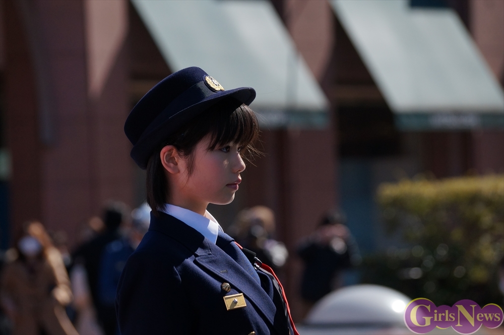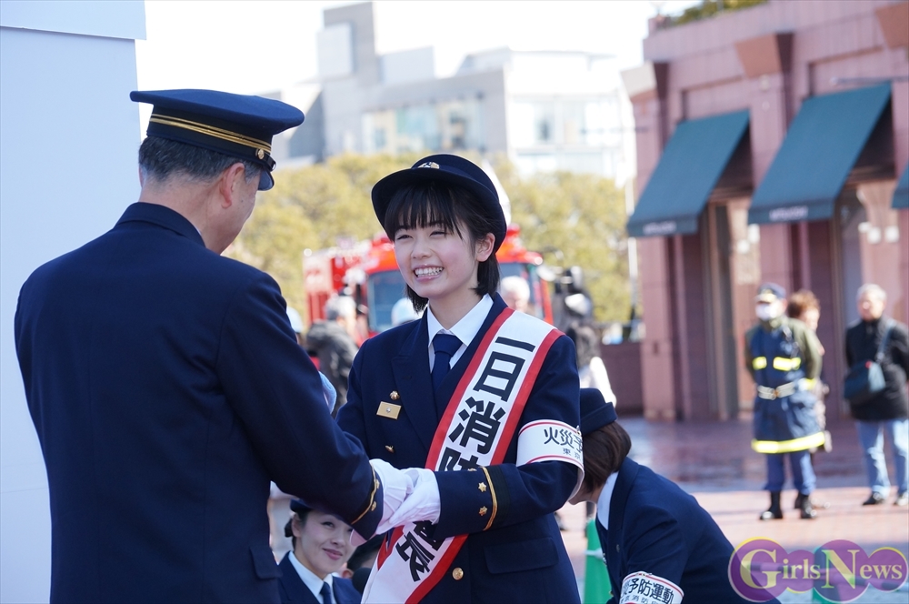 この日、小芝風花さんは、ビシッとした制服姿に身を包み、一日消防署長として消防隊を指揮。「放水始め!」の号令で一斉放水が行われた。
