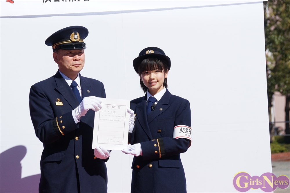 小芝風花さんは「消防隊の活動を見たのは初めてでしたが、チームワークのとれた動きで人名救助や消防活動をしてる姿を見て感動しました。同時に地震の怖さも感じました。私が生まれる前に起きた、阪神・淡路大震災の恐ろしさはいつも母親から聞かされてました。地震はいつ起こるかわかりません。大切な人を守るために心の備えが大切なんだと思います。今日、お家に帰ったら、部屋の家具類の固定を確認します。みなさんも家具類の転倒・落下防止装置を確認したり、家族で地震について話し合ったりしていただきたいと思います。」と総評。