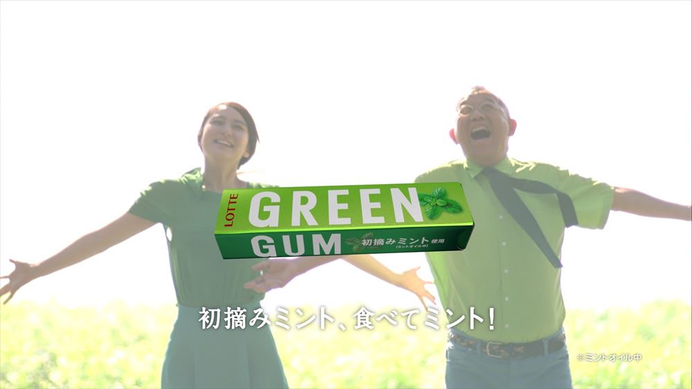 どちらのCMもグリーンガムを食べて、パッと広がるミントの香りと味を感じると、2人は広大なミント畑の中へ。「初摘みミント」がもたらすフレッシュな香りと美味しさを体一杯で表現するシーンでは、リニューアルされた『グリーンガム』の爽やかな美味しさが伝わってくるような作品に仕上がっている。