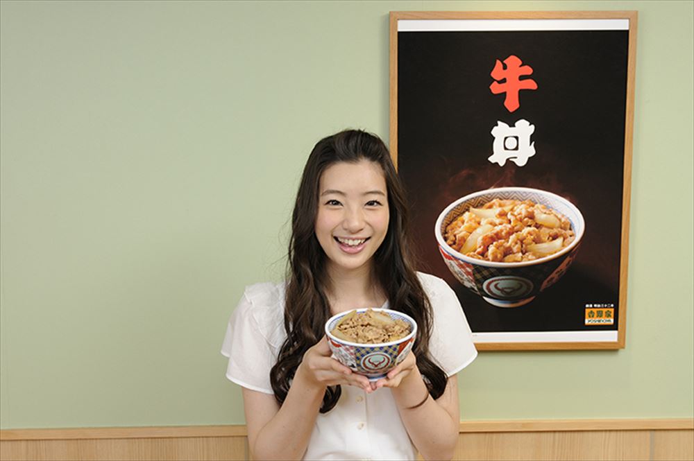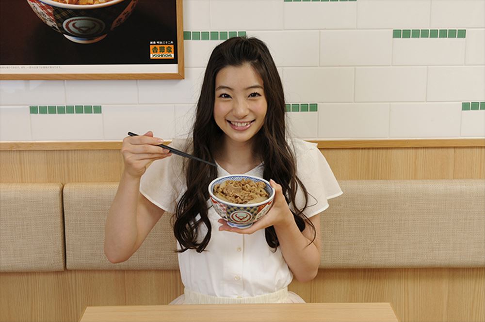試食シーンの撮影では、無理して食べなくても良いと言われながらも、お肉をおかわり。「小学生の頃かな、実家の冷蔵庫によく吉野家さんの冷凍牛丼が置いてあって、しょっちゅう食べていました。それ以来の“吉牛ファン”です。」と、吉野家の牛丼に、子供の時から親しんでいたことを紹介してくれた。また、今回の取材をきっかけに「これまで吉野家のお店には、友だちや、事務所の人と一緒に行ったことはあったのですが、今度は是非 “一人吉野家”に挑戦します!」と、引き続き吉野家の大ファンであることを宣言した。