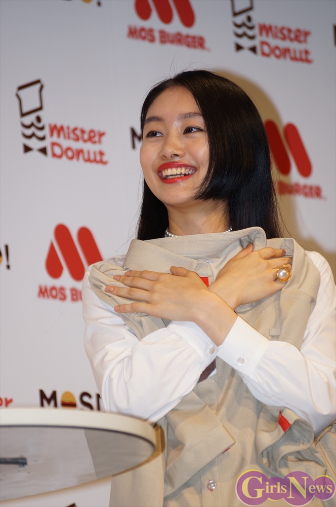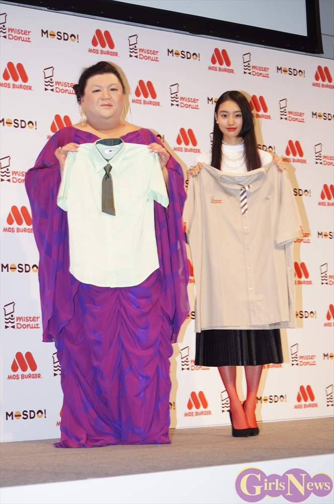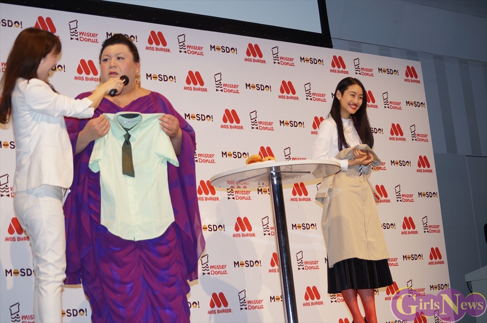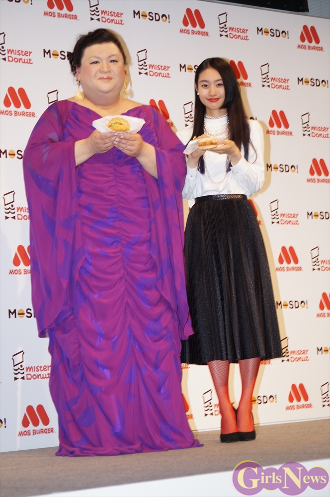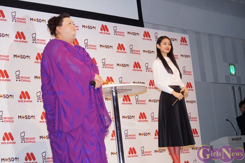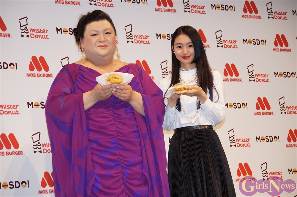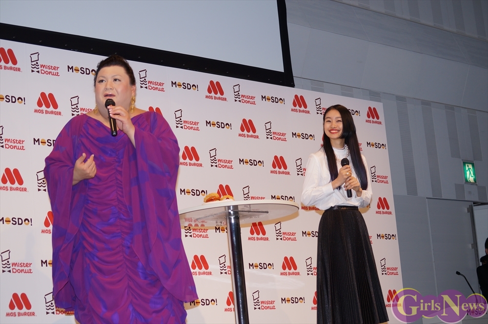 5月27日、モスバーガーを運営するモスフードサービスとミスタードーナツを運営するダスキンのコラボレーションブランド「MOSDO!(モスド)」の新商品&新CM発表会が都内で行われ、CMキャラクターを努めるタレントのマツコ・デラックスと女優の忽那汐里が出席した。
