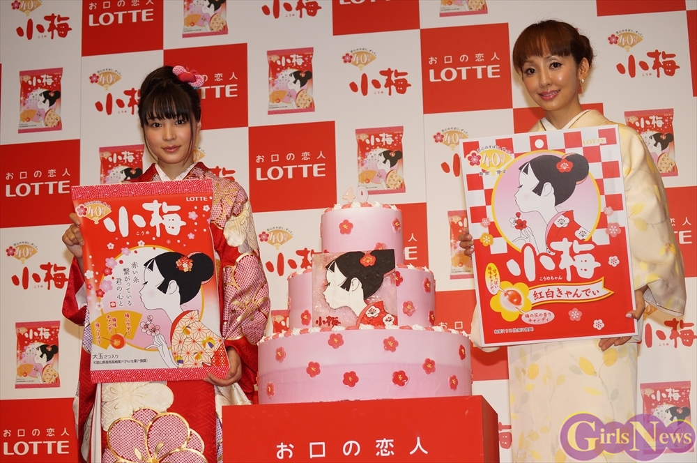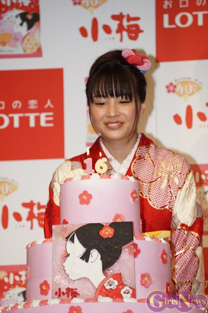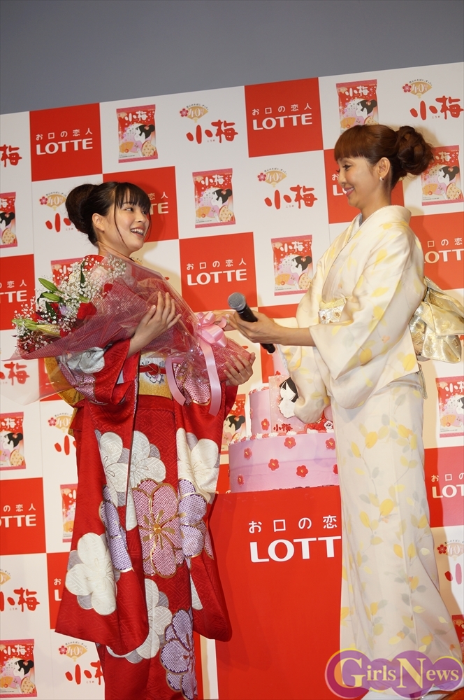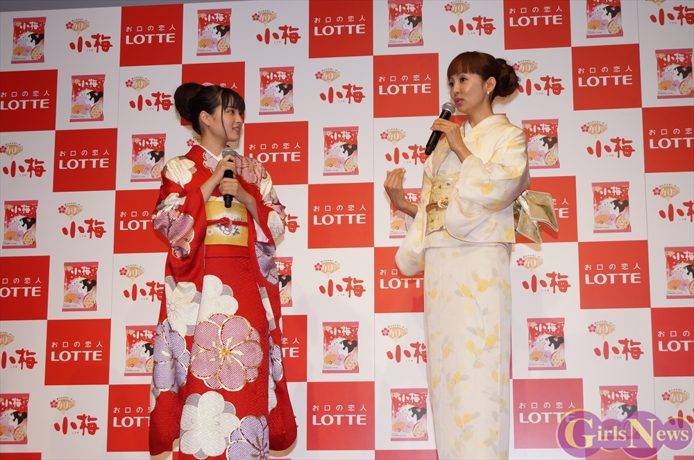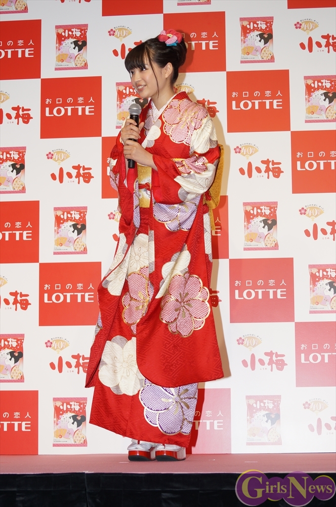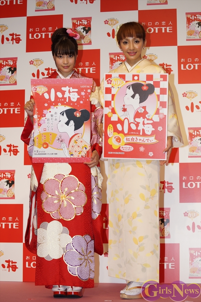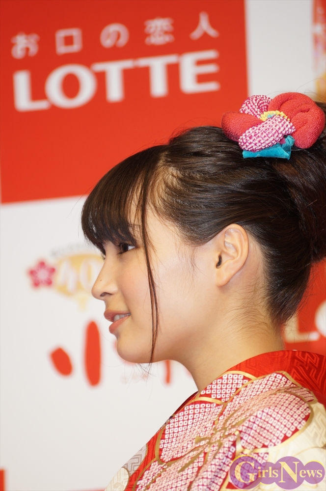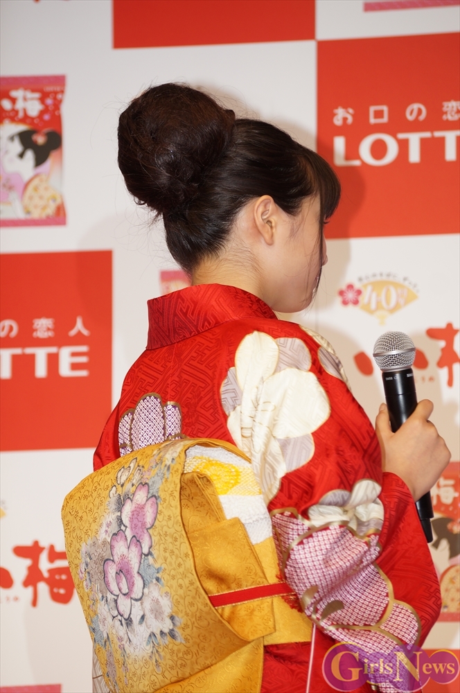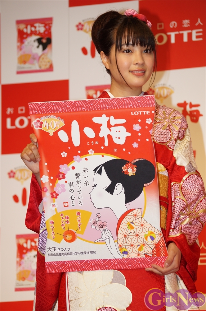 6月17日、ロッテ『小梅』40周年記念『小梅の恋叶えプロジェクト』発表会が行われ、同プロジェクトのアンバサダーを努める人気急上昇中の若手女優 広瀬すずさんが小梅ちゃんのキャラクターをイメージした赤い着物姿で登場した。