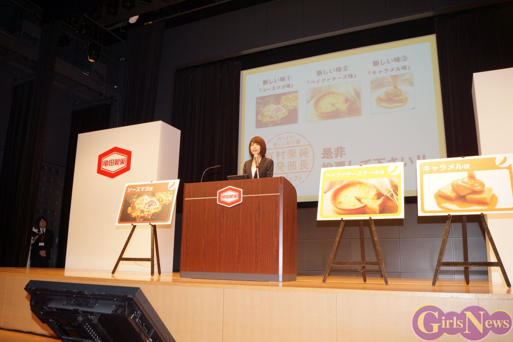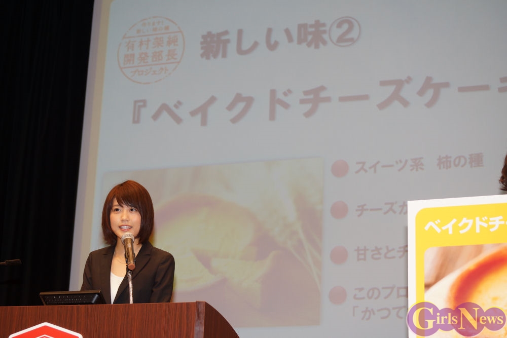 そして有村架純さんは亀田の柿の種 開発部長として演台の前に立ち、新味をプレゼンテーションした。