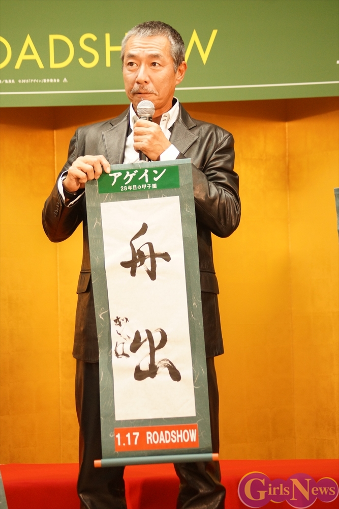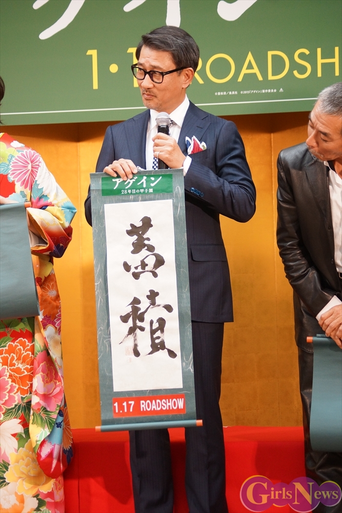 柳葉敏郎さんは「舟出」と書き「2015年、この作品が公開されることが、柳葉敏郎の舟出です。私事ですが、上の子供が高校に入る予定です。下の子供が小学校に入ります。それぞれ新たな舟出するということがあって、父親として一緒に手を取り合って荒波に舟出しようと思って書かさせていただきました。」とそれぞれの思いをコメント。