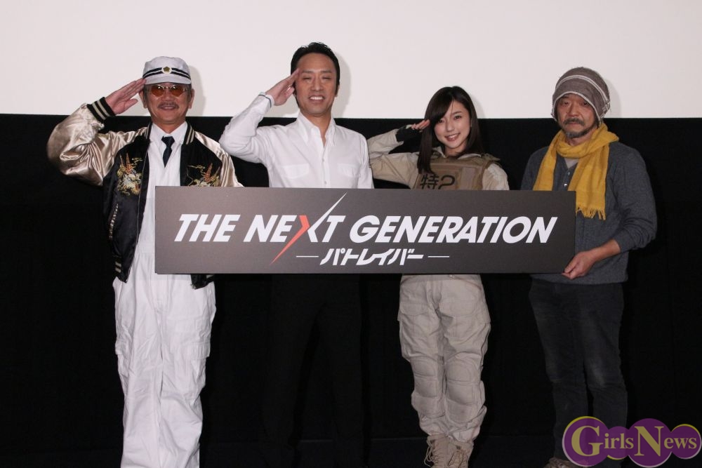 1月10日、劇場版実写映画「パトレイバーTHE NEXT GENERATION 第七章」の初日舞台挨拶が、新宿ピカデリーで行われ、出演者の真野恵里菜さん、筧利夫さん、千葉繁さん、そして、押井守監督が登壇した。