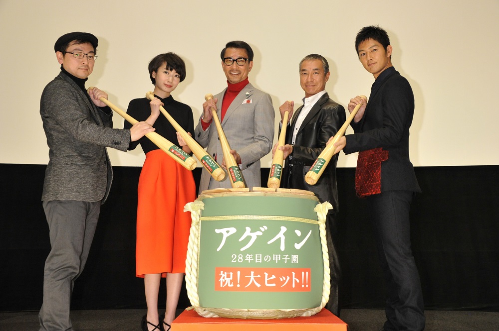 1月17日、映画「アゲイン 28年目の甲子園」の初日舞台挨拶が丸の内TOEIで行われ、中井貴一、波瑠、工藤阿須加、柳葉敏郎、大森寿美男監督が登壇した。