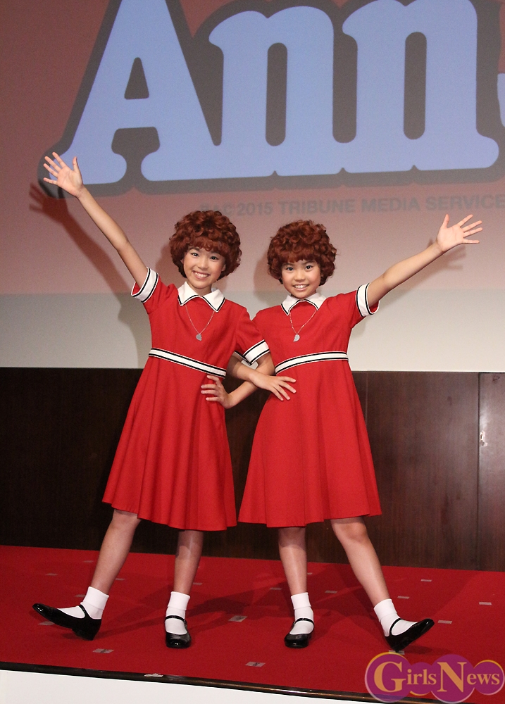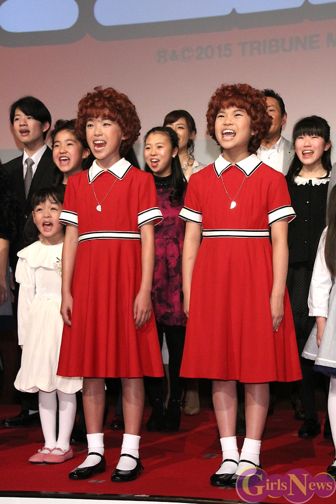 9千人を超える応募者の中からオーディションでアニー役のWキャストに選ばれた二人は、アニーの赤い衣装をまとってにっこり。黒川桃花さんは「憧れだったアニーの衣装を着ることができて、とっても幸せです。元気で明るい、前向きなアニーにしたいです!」と意気込んだ。前田優奈さんも「嬉しいし、興奮しています。元気でお客さんに感動してもらえるアニーを演りたい!」とアピールした。