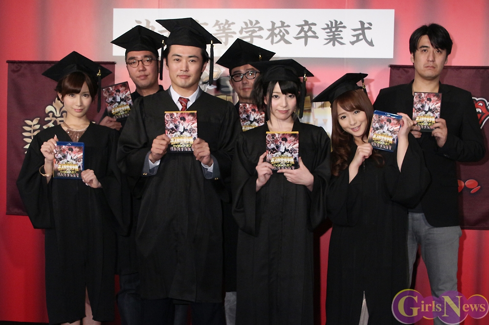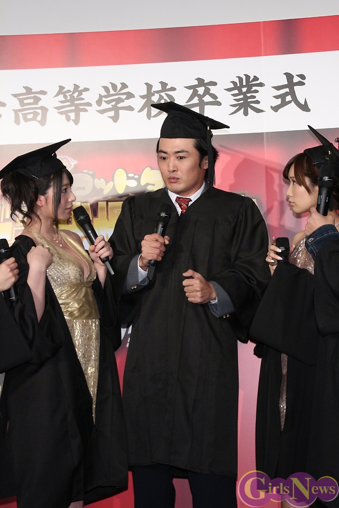 映画公開から4ヶ月にして早々のリリースとなった「キス我慢選手権 THE MOVIE2」だが、本作の発売をもってこの映画からの“卒業”ということで、神舌(ゴッドタン)高校の卒業式というシチュエーションで会見は行なわれた。