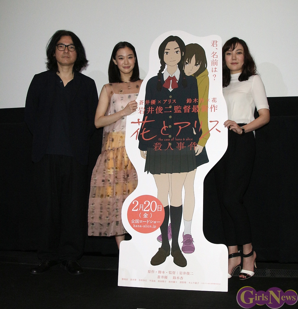 2月20日、映画「花とアリス殺人事件」が公開初日を迎え、出演者の蒼井優さんと鈴木杏さん、そして岩井俊二監督が、新宿バルト9で行われた舞台挨拶に登壇した。