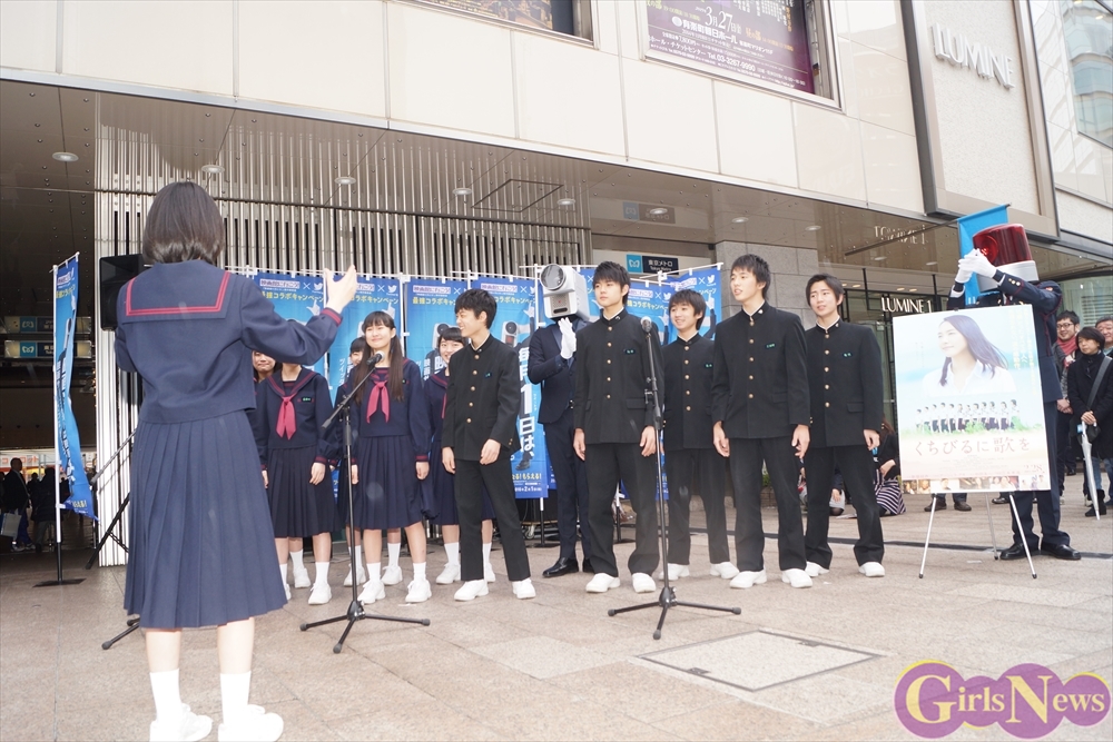 最後には合唱部員たちが広場に集まった人々にヒットを願って映画のチラシを配布し宣伝を行った。