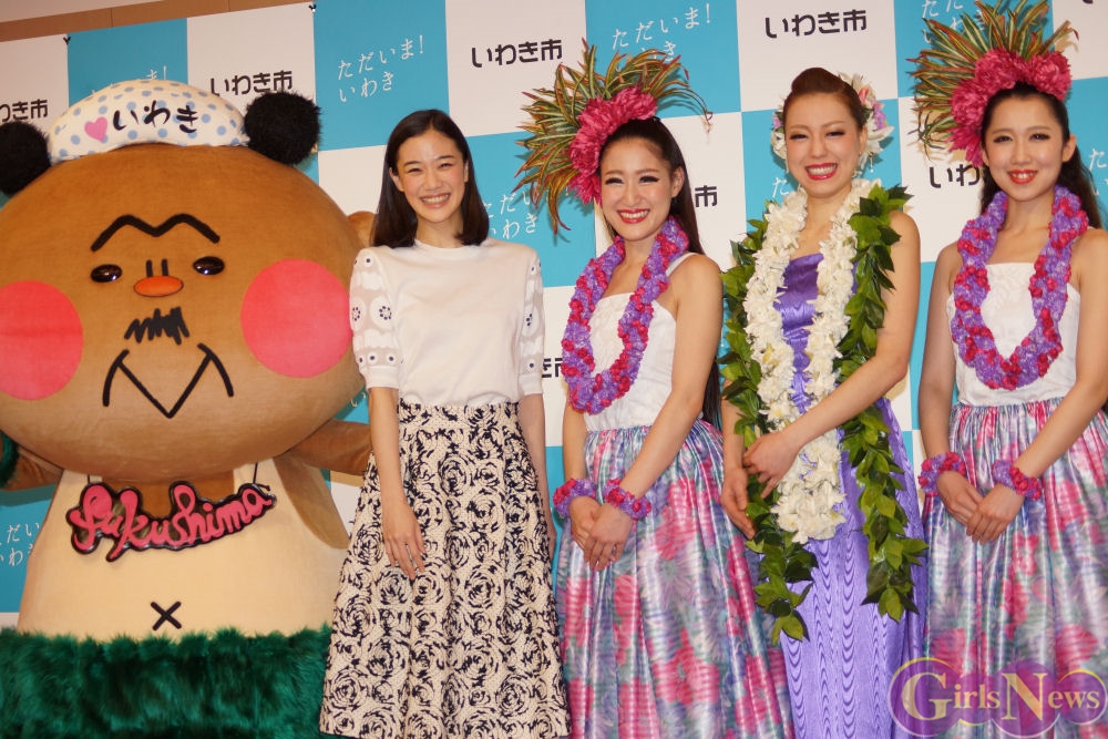 この日のイベントには、いわきのゆるキャラのフラおじさんやフラガールたちも駆けつけました。
