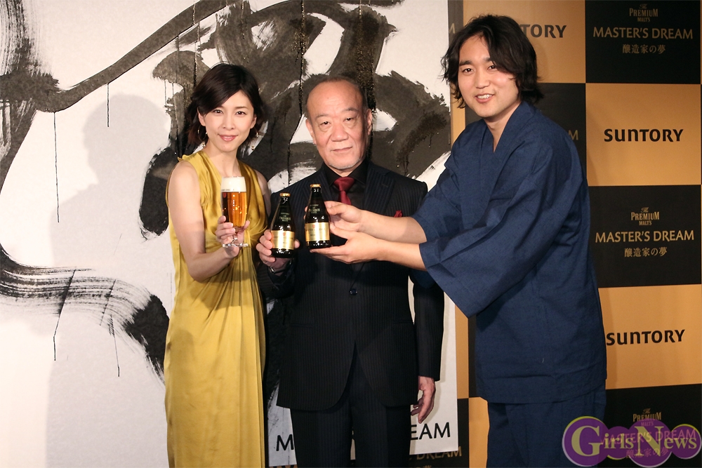 3月3日、サントリービールの新商品「~ザ・プレミアム・モルツ~マスターズドリーム」が店頭での発売より一足先に味わえる期間限定ラウンジ「Master’s Dream Lounge」のオープンを記念したイベントが六本木ヒルズ内の同店で行なわれ、新CMの音楽を担当した久石譲氏と書道家の武田双雲氏、そして、女優の竹内結子さんがゲストとして出席した。