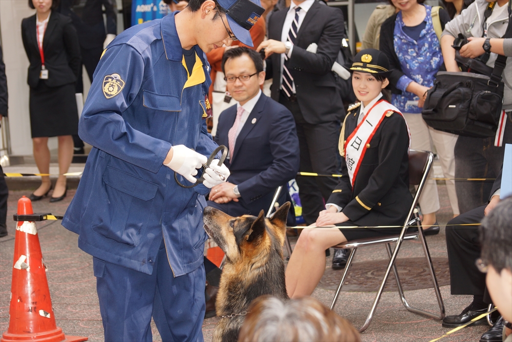 その後、警察犬による展示訓練も行われ、日ごろ行っている警察犬の訓練の様子を実際に披露され、さらに吉本実憂さんがハンカチに自分のニオイを付け、それを複数のハンカチの中から当てる訓練では、すぐに吉本実憂さんのニオイが付いたハンカチを警察犬が当ててしまい、吉本実憂さんもびっくり。