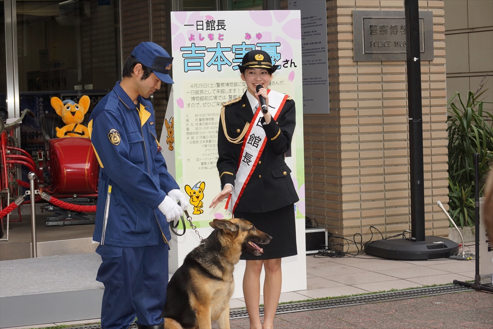 警察博物館の前の広場でトークショーも行われ、警察官のイメージについて吉本実憂さんは「実は小学生の時に、ちょっとだけ武道を習っていまして、警察官に少し憧れている時期がありまして、その時にパトカーが通ると、よく敬礼をしてたんですね。その時に警察官の方が敬礼を仕返してくれて、すごい優しいなというイメージがありました。」と思い出を語る。