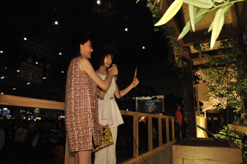 4月26日、幕張メッセで行われたニコニコ超会議の松竹&松竹芸能ブースに、シークレットゲストとして映画「リアル鬼ごっこ」(7月11日公開)に出演しているトリンドル玲奈さんと篠田麻里子さんが登場した。