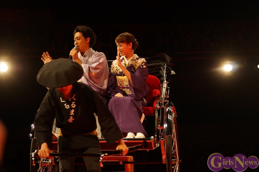 最初に登壇したのは大泉洋さんと戸田恵梨香さんを除く6名。大泉洋さんの“ちょっと待ったぁ!”の声と共に、大泉洋さんと戸田恵梨香さんは人力車に乗って駆け込み、舞台挨拶に間に合った。