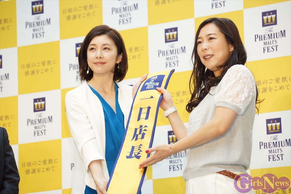 言葉巧みにプレモルのまつわるエピソードを交えたプレゼンを行い、椿鬼奴さんは「これからはプレモルを絶やさない家庭を築いていきたい!」とプレモル愛を語ると、実は「ザ・プレミアム・モルツフェスト」の1日店長を選ぶプレゼンだったことが明かされ、プレモル愛を見事に語った椿鬼奴さんを1日店長に選出。竹内結子さんから1日店長の襷が授与された。