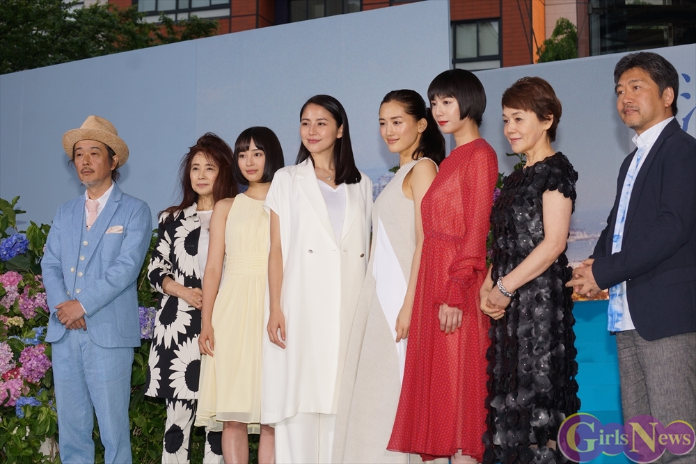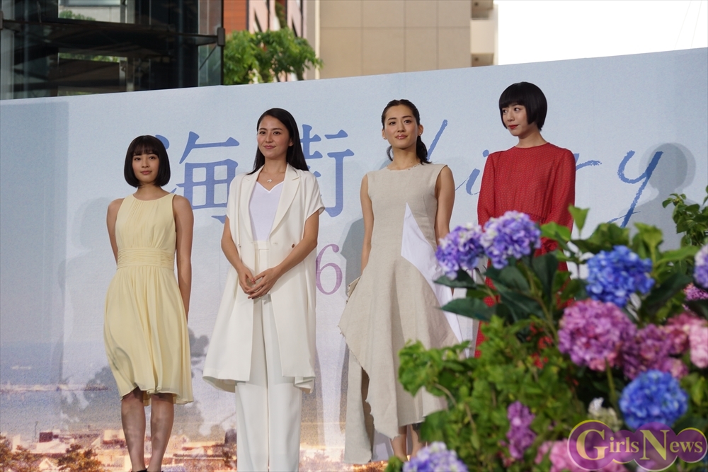 5月11日、映画「海街diary」完成披露イベントが六本木ヒルズアリーナで行われ、四姉妹役を演じた綾瀬はるか(長女)、長澤まさみ(次女)、夏帆(三女)、広瀬すず(四女)と、四姉妹を見守る大人キャストの大竹しのぶ、風吹ジュン、リリー・フランキー、そして是枝裕和監督が登壇した。