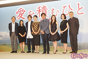 5月13日、映画『愛を積むひと』の完成報告会見が都内で行われ、佐藤浩市、樋口可南子、北川景子、野村周平、杉咲花、吉田羊、柄本明、そして朝原雄三監督が登壇した。