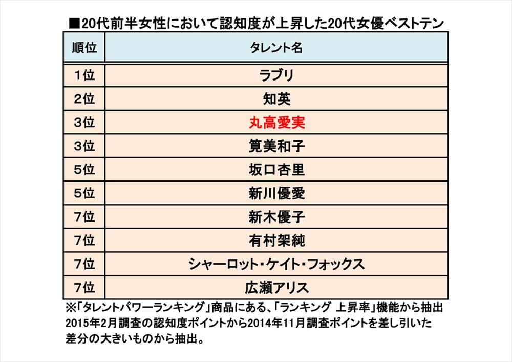 3ヶ月に1度、1000組以上の著名人の認知度や関心度について調査して、雑誌『日経エンタテインメント!』でも毎年1回特集を組む「タレントパワーランキング」(調査実施会社:アーキテクト)によると、丸高愛実に対するイメージとして、「かわいい」「健康的な」「活発な」「親しみやすい」などの回答の割合が高かった。「健康的な」や「親しみやすい」の数値が高いというのは、持ち前のナチュラルな魅力が高く評価されていて、好感度が高い証拠と言っていい。彼女に対する関心が特に高い年齢層のひとつである25~29歳男性の回答を集計すると、丸高とイメージのグラフ分布が似ている女優としてコンピュータがはじきだしたのは、榮倉奈々・武井咲・倉科カナ・夏帆の4人で、いずれも正統派タイプの女優だった。