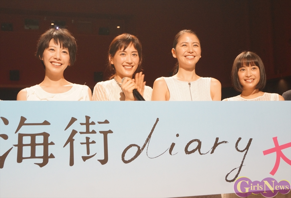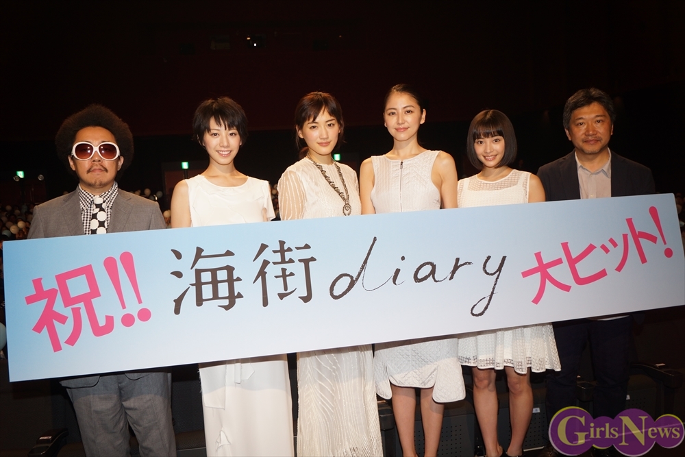 6月13日、映画「海街diary」公開初日舞台挨拶が有楽町・TOHOシネマズ日劇2で行われ、女優の綾瀬はるか・長澤まさみ・夏帆・広瀬すずの四姉妹と是枝裕和監督が登場した。